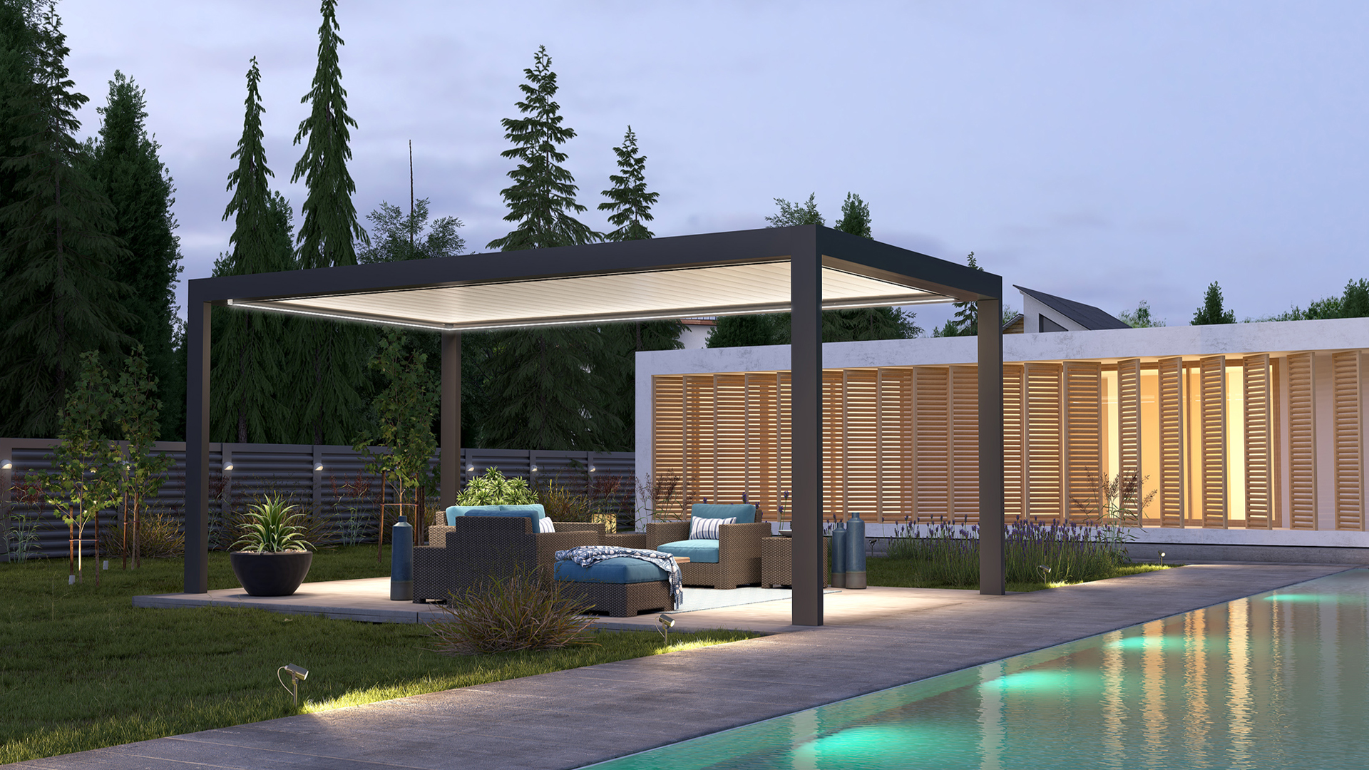 Our pergola structure is built with aluminum columns and posts that support a series of rafters or latticework that serves as a cover for a patio or a promenade, other styles and designs also can be built with water prove insulated aluminum roof panels that will protect from the rain, the heat from the sun and the UV rays.